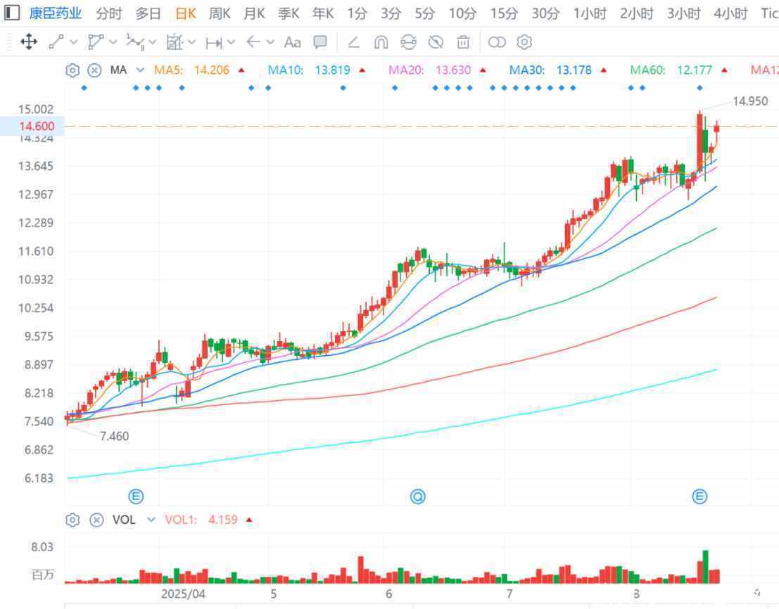 智通财经 APP 观察到,8 月 19 日在披露 2025 年中报后,康臣药业午后股价迅速拉升,盘中股价触及 14.95 港元,刷新公司上市以来股价新高。拉长时间线来看,年初至今,康臣股价累计涨幅已超 80%。