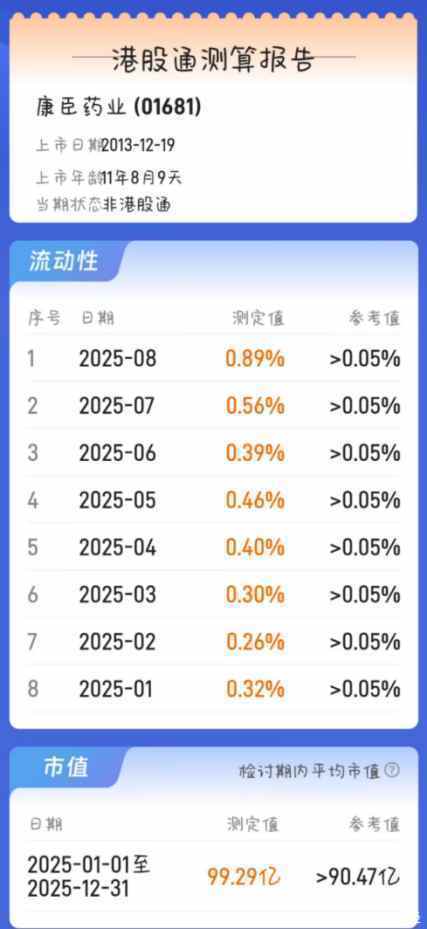 按照港股通既定逻辑,恒生综合指数每年都会在固定的两个时间点 —— 即 6 月 30 日和 12 月 31 日进行定期检讨。最新数据显示,截至 2025 年 8 月 22 日,港股上市公司要想进入港股通,其检讨期内港股日均流通市值门槛大约为 90.47 亿港元。根据智通财经 APP 计算,目前康臣药业在今年 12 月末截止的检讨期港股日均市值为 99.29 亿港元,已高于当前的 “入通门槛”,且每月股票流动性也完全达标,因此公司在今年 12 月底的定期检讨将有极大概率被纳入港股通名单。