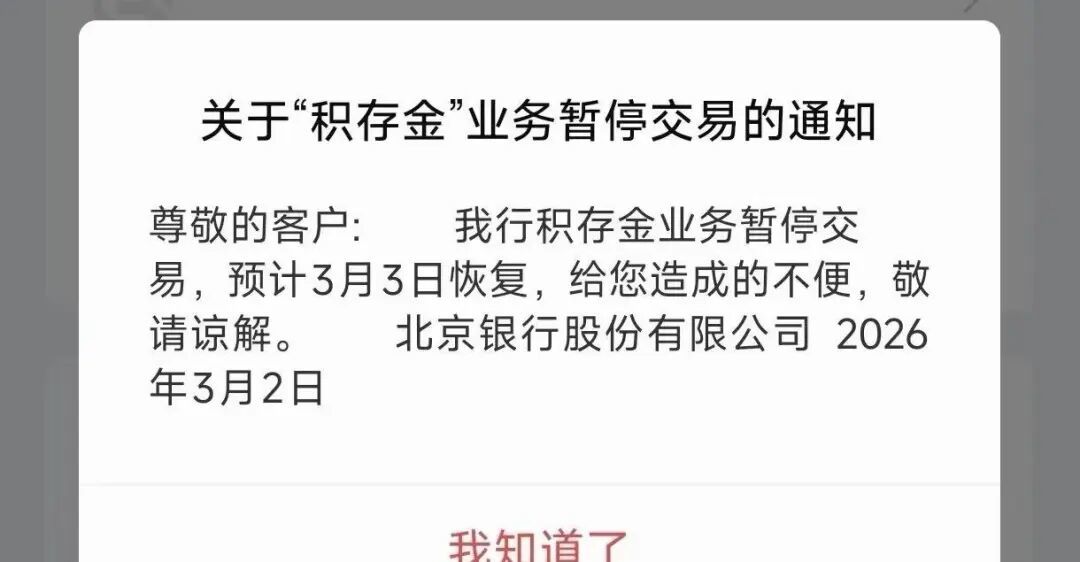 异常发生后不久,北京银行手机银行APP上的积存金业务模块入口随即“消失”。用户打开相关页面后,系统弹窗显示了一份《关于“积存金”业务暂停交易的通知》,称积存金业务暂停交易,预计于3月3日恢复。
