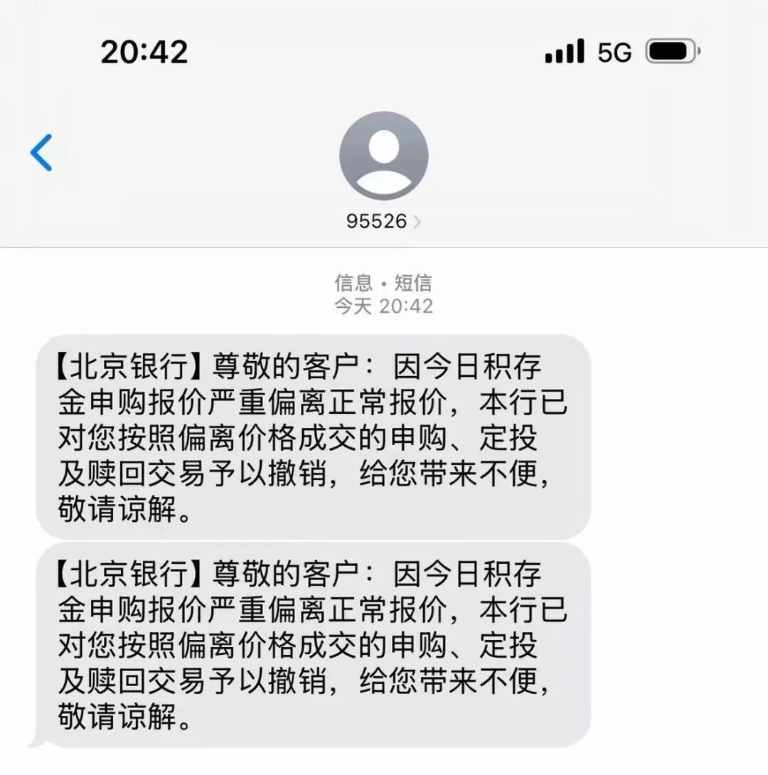 据早间以1.6元/克价格成功购入黄金的用户反馈,晚间20:42左右,北京银行主动联系了相关客户,告知此次交易将被撤销。
