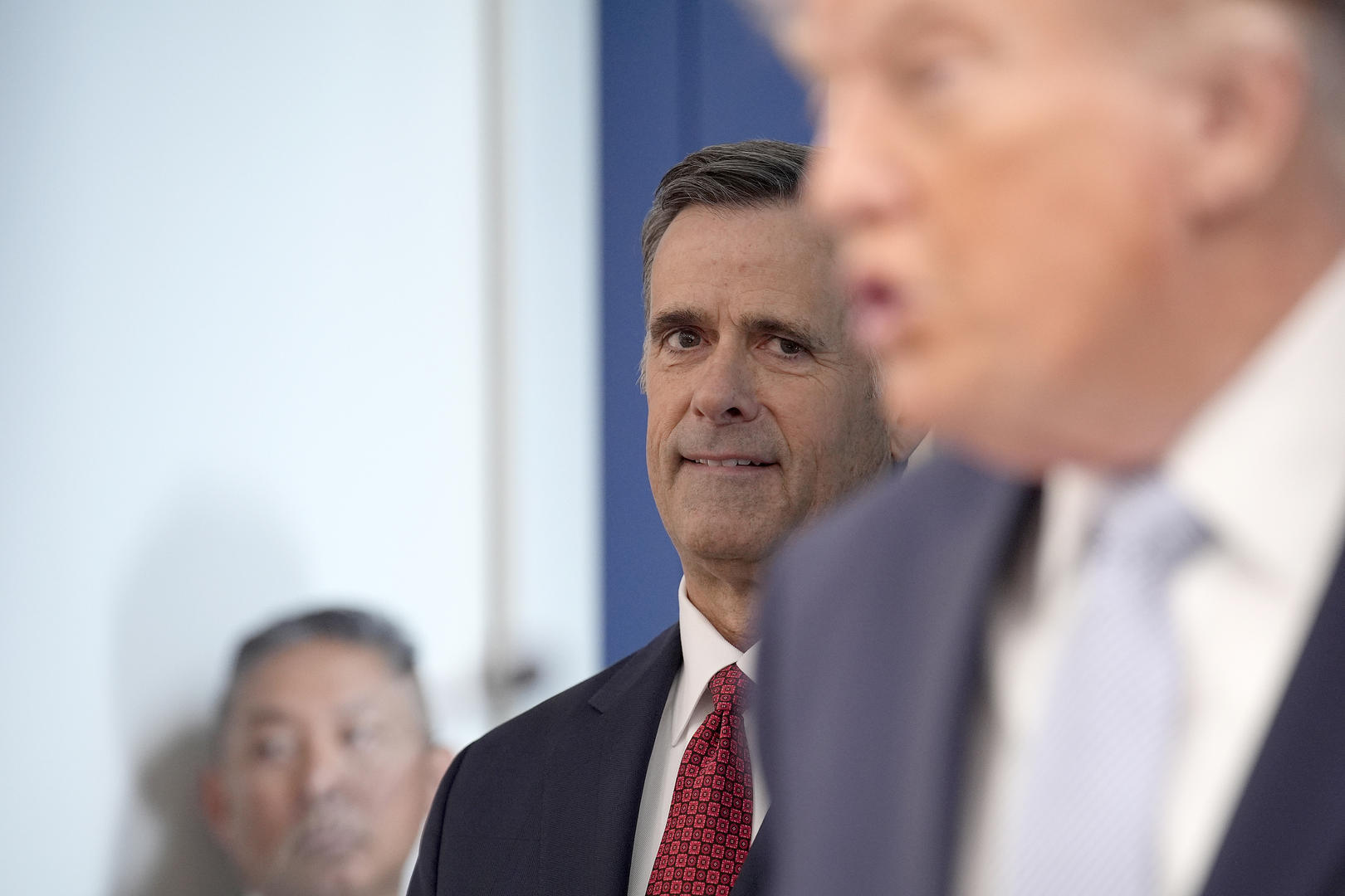 ▲当地时间2026年4月6日,中央情报局局长拉特克利夫聆听美国总统特朗普在新闻发布会上的讲话 图据视觉中国