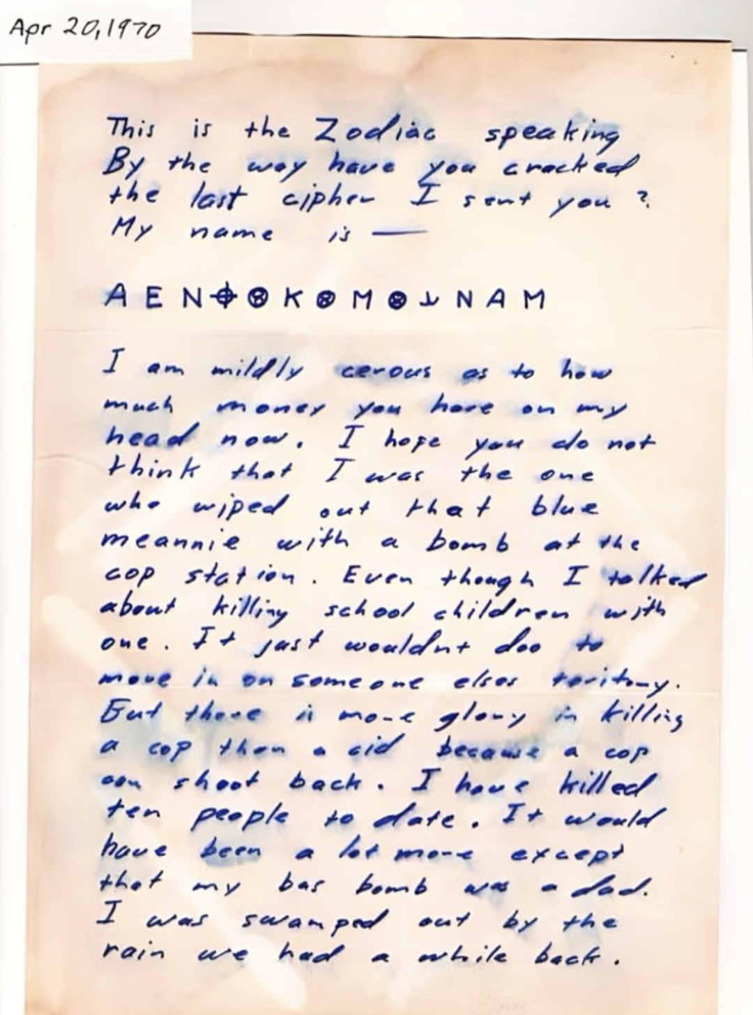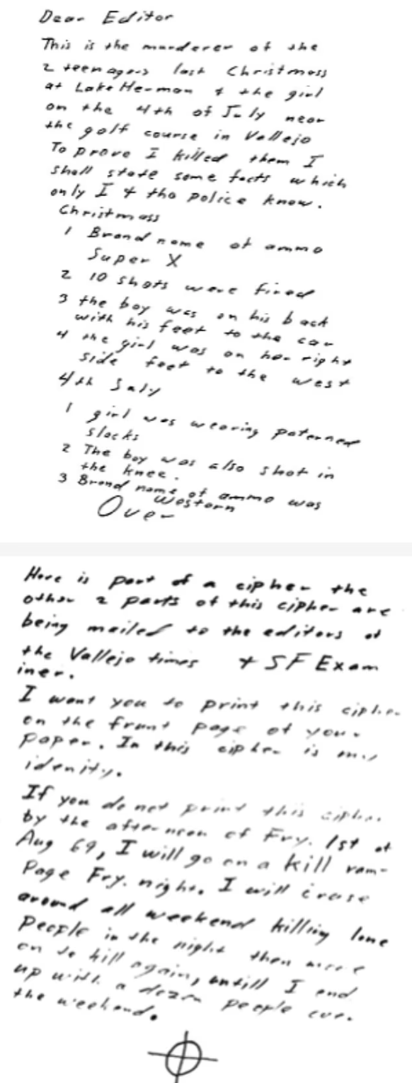 1969年8月,“十二宫杀手”开始与媒体周旋——他给三家当地报纸寄信,声称对这两起袭击事件负责,并在信中附上了他的第一个密码Z408。