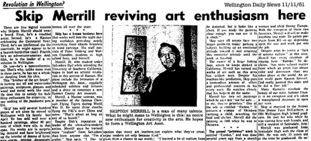1960年移居堪萨斯州后,马文·梅里尔摇身一变,成为了一名艺术家。一篇报纸文章报道了他,文中他声称自己曾师从萨尔瓦多·达利,并夸大了自己的服役经历。© Alex Baber