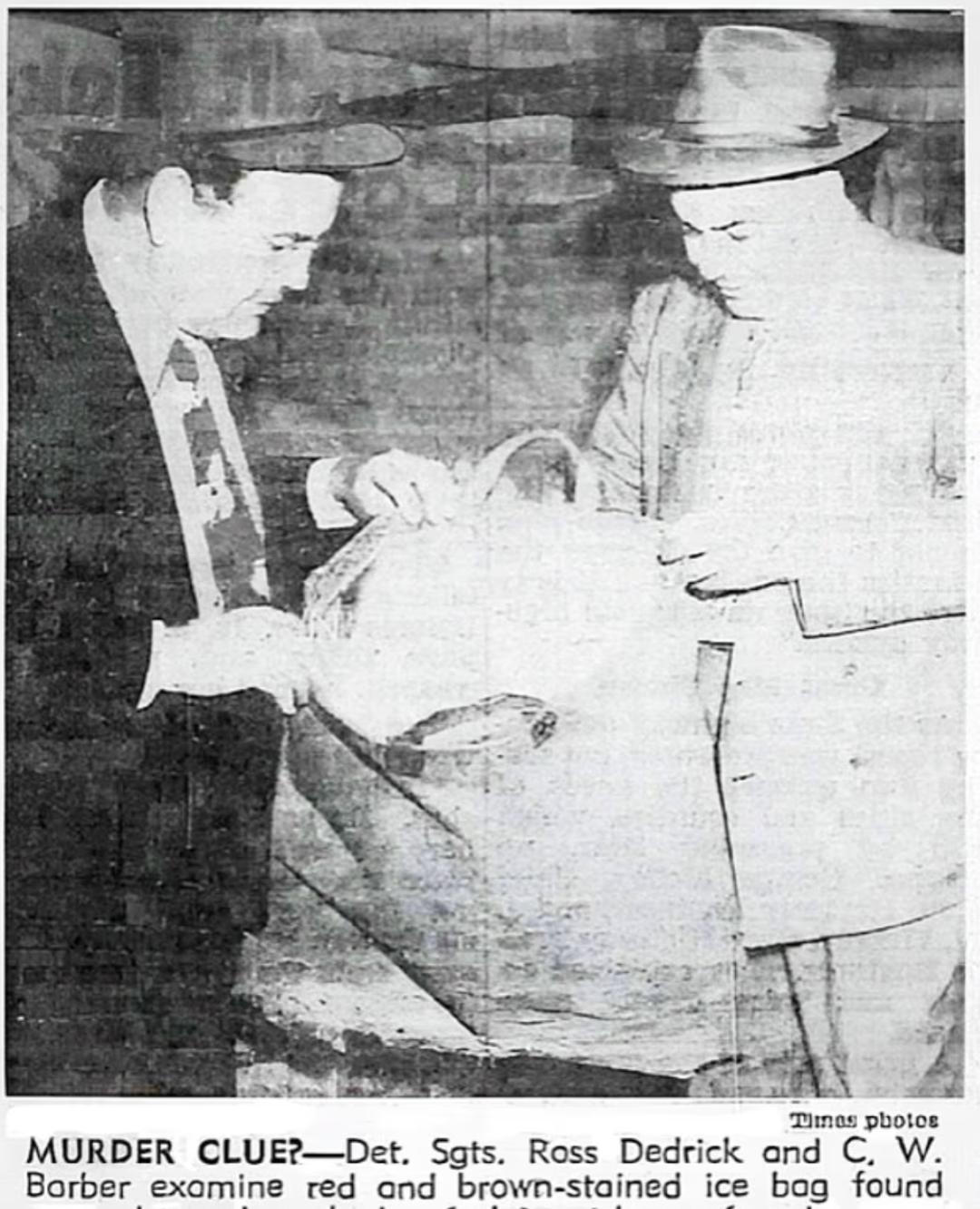 报纸上的一张照片显示,警察正在查看一个帆布冰袋,袋子上标有字母“Z”,该冰袋是在发现肖特尸体的地方附近找到的。巴伯认为这支持了他关于“十二宫杀手汽车旅馆”的理论。© Alex Baber