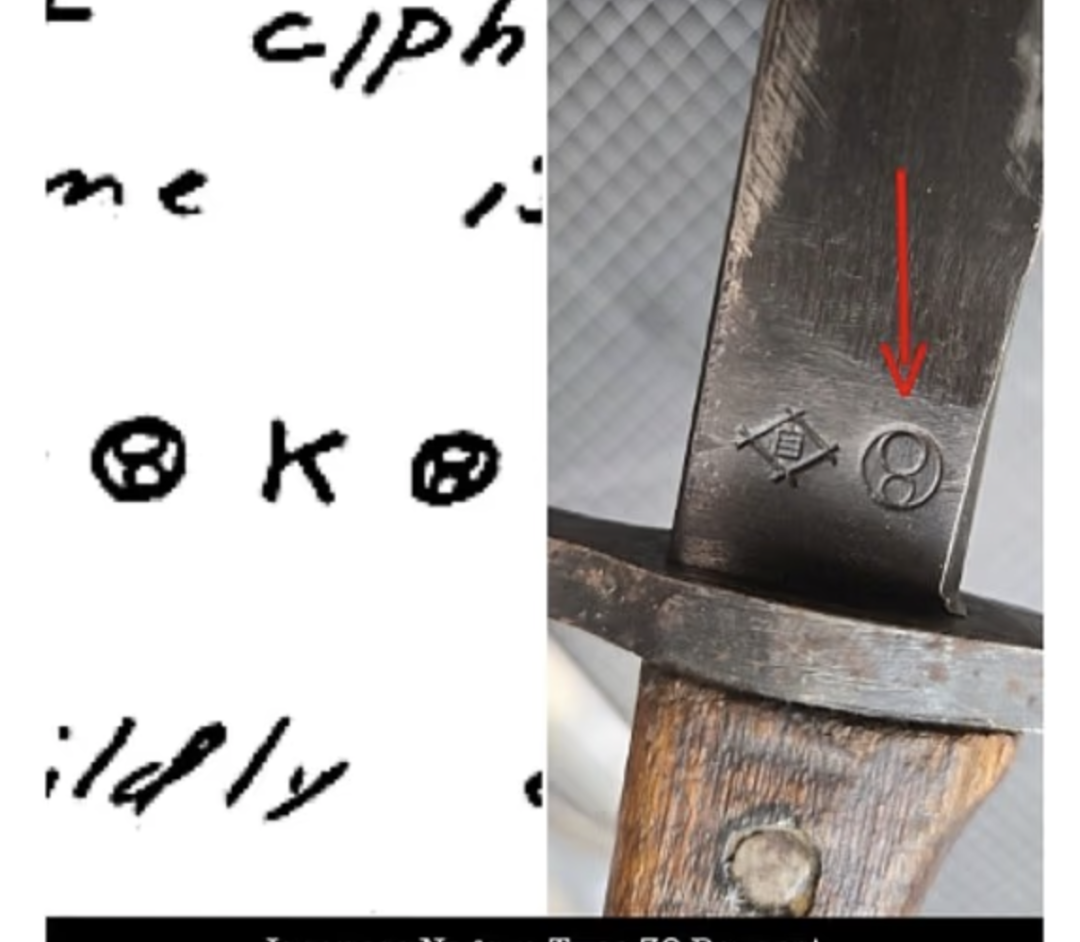 刺刀上的符号与十二宫杀手复杂密码中的一些符号相呼应。© Alex Baber
