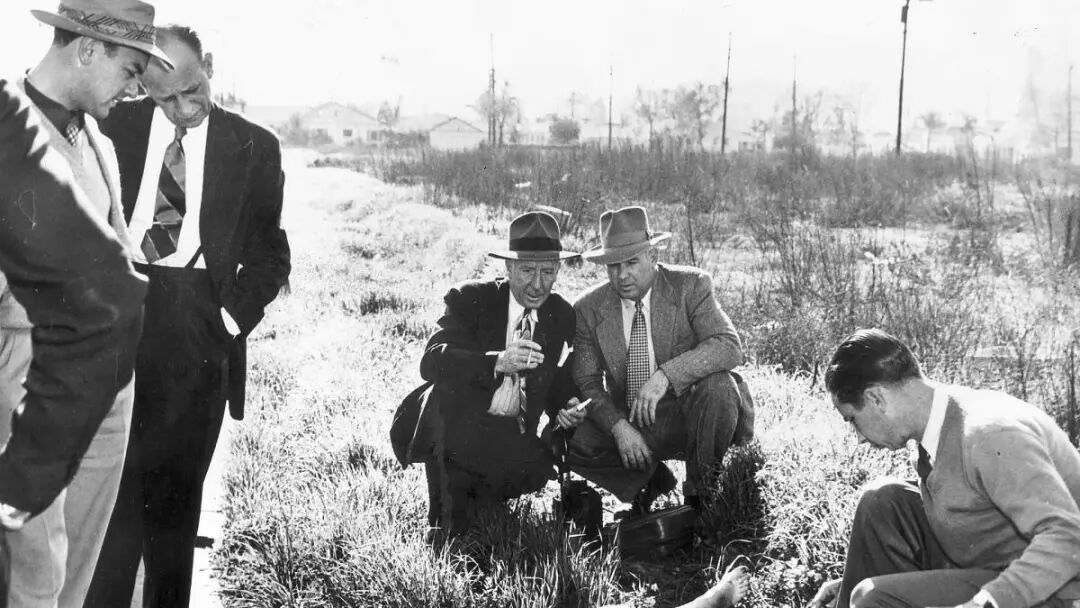 1947年1月15日清晨,一位妇女带着孩子走过洛杉矶莱默特公园附近街区时,目睹了令人毛骨悚然的一幕:一具赤裸的尸体从腰部被干净利落地切成两半。执法人员已抵达犯罪现场。© Los Angeles Times