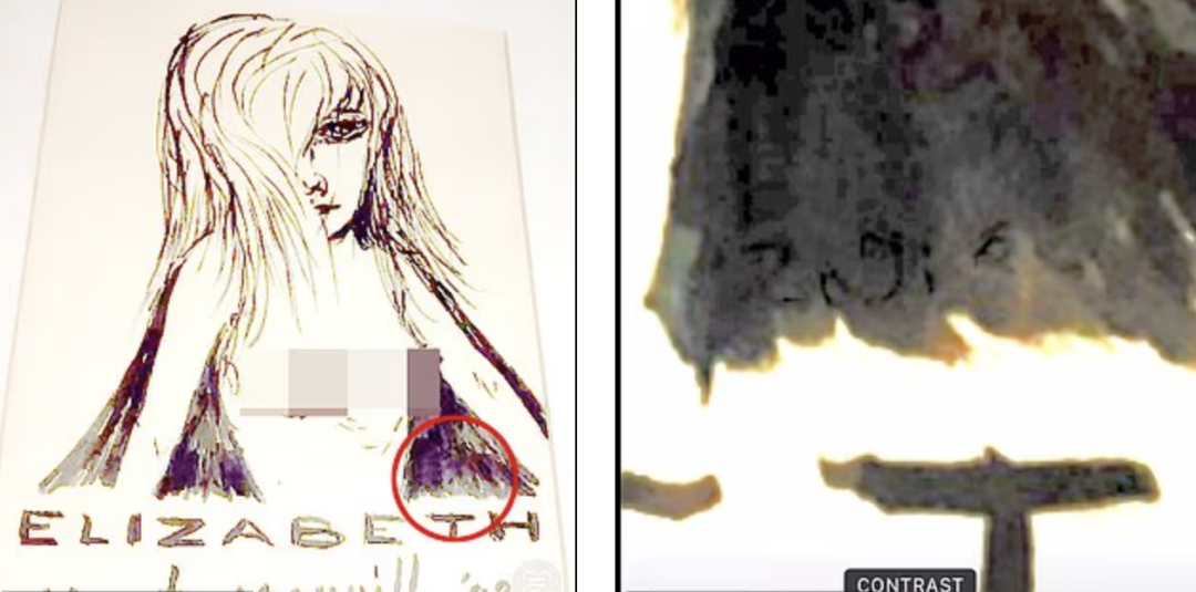 在这名女性形象下方,写着“ELIZABETH”这一名字,全部使用大写字母,其笔迹与十二宫杀手信件中的手写风格惊人地相似。这幅素描署名为“Marty Merrill ’92”,与其儿子提供的支票及其他文件上的签名一致。