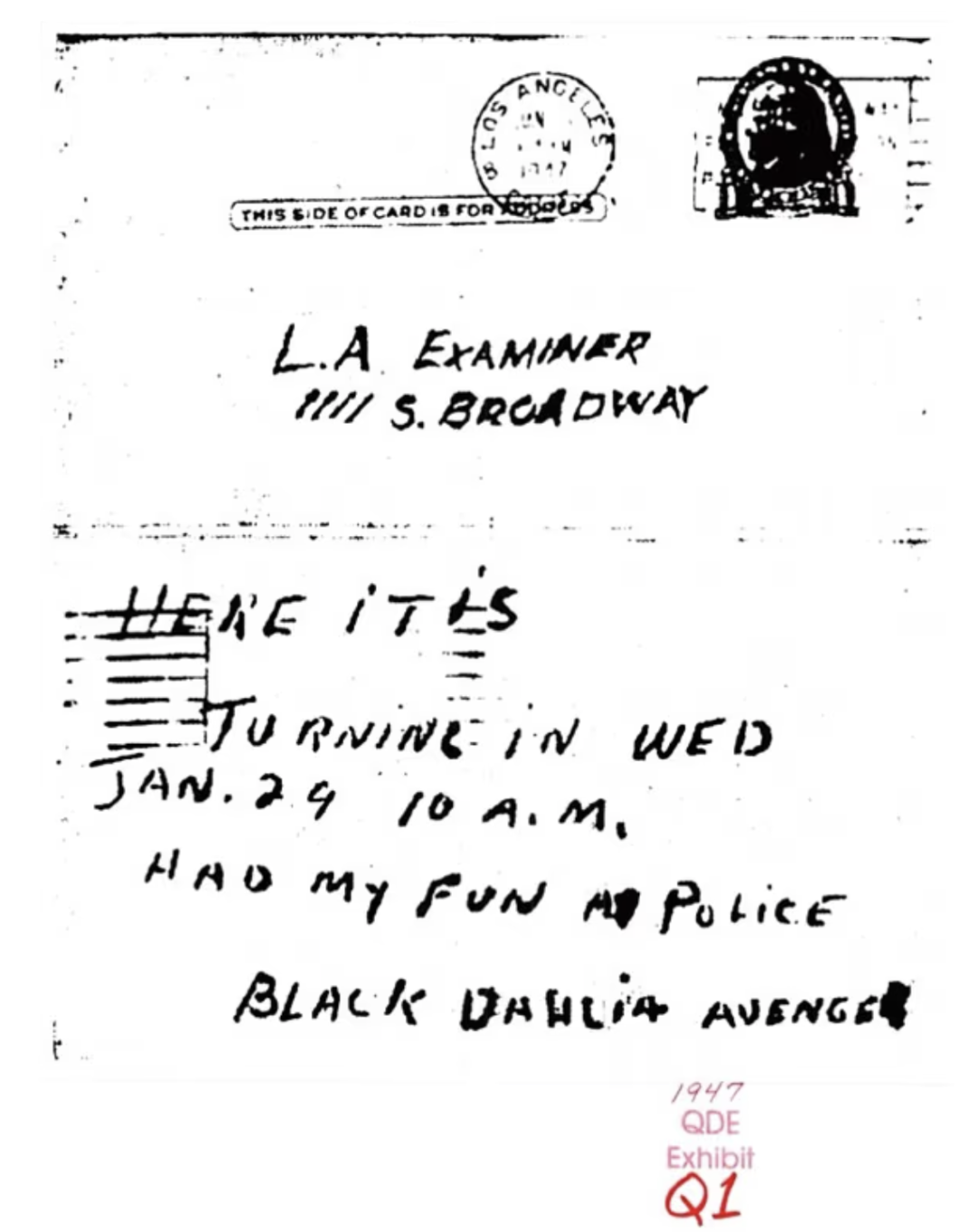 署名“黑色大丽花复仇者”的手写明信片。© Alex Baber