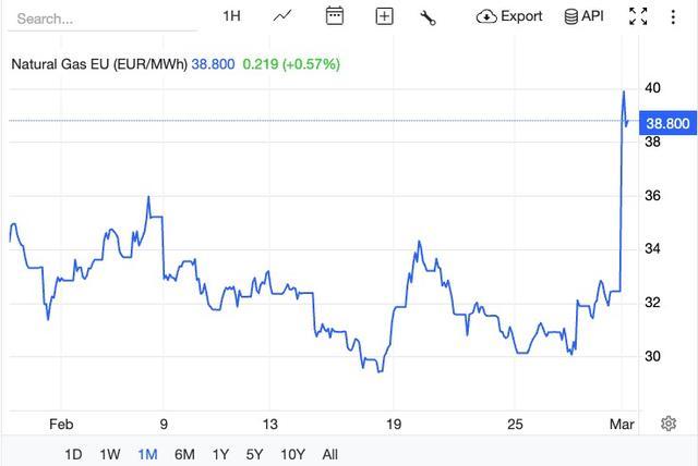 根据tradingeconomics的数据,3月2日,欧洲天然气期货上涨超过22%,突破每兆瓦时39欧元,接近6月高点。