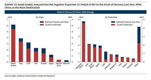 特别是中国,2024年中国日均进口原油1100万桶,经过霍尔木兹海峡的原油进口为478万桶/日,占比约为43.5%。