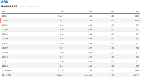 从2月单月情况看,上交所个人新开A股账户251.6万户,环比减少238.94万户;机构新开A股账户约0.71万户,环比减少0.35万户。此外,上交所基金新开户23.97万户,环比减少30.66万户;B股新开户0.06万户,环比微增。若将A股、B股、基金新开户数加总,2月上述三类账户合计新开276.33万户,同一口径下环比减少约269.94万户。